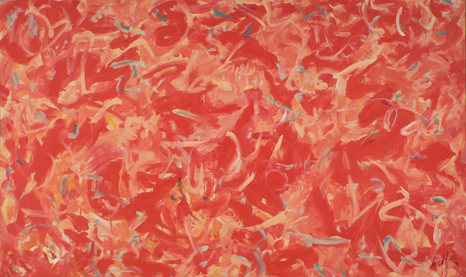 All reds, beige, and pinks with teal highlights. Verso. In marker on TL stretcher bar: 19/AC/2006 94 x 57. Sticker on TC stretcher bar: NELTJE Top / Lunatic Beauty / Acrylic On Canvas 2006 / 94" x 57" 19/AC/2006. Next on stretcher bar: 94 x 57 19/AC/2006. In pencil on top of both vertical stretcher bars: 52 3/4.