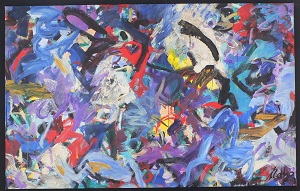 Multiple colors including browns, blues, red, greens, pinks, purples. Dripping throughout. Brown, green, and purple drips in BC. 3 short, vertical teal lines in TR corner. Short, dark pink lines in BC. Verso. On TC stretcher bar: 16/AC/2006 A Cricket Crossing His Legs. Stamp: NELTJE Top / A Cricket Crossing His Legs / Acrylic On Canvas 2006 / 88" x 57" 16/AC/2006. Next in marker: 88 x 57.