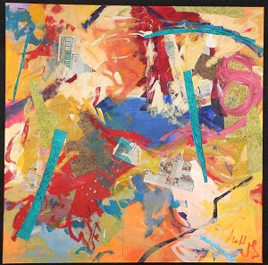 Mixed Media material: hand-made paper, foreign-language newspaper, paint. Paint colors are orange,yellow, reds, blues, greens. TC is primarily orange and red. Green paper in CL and CR. Teal strips of paper in CL/BL, CR, and TC/TR. Verso. TC vertical stretcher bar: Jubilant Echoes / 33/AC/2006. Sticker below: NELTJE Top / Jubilant Echoes / Acrylic & Mixed Media 2006 / 72" x 72" 33/AC/2006. Below: 67 3/4. Stamped below: <symbol> DEAD <symbol> STRAIGHT.