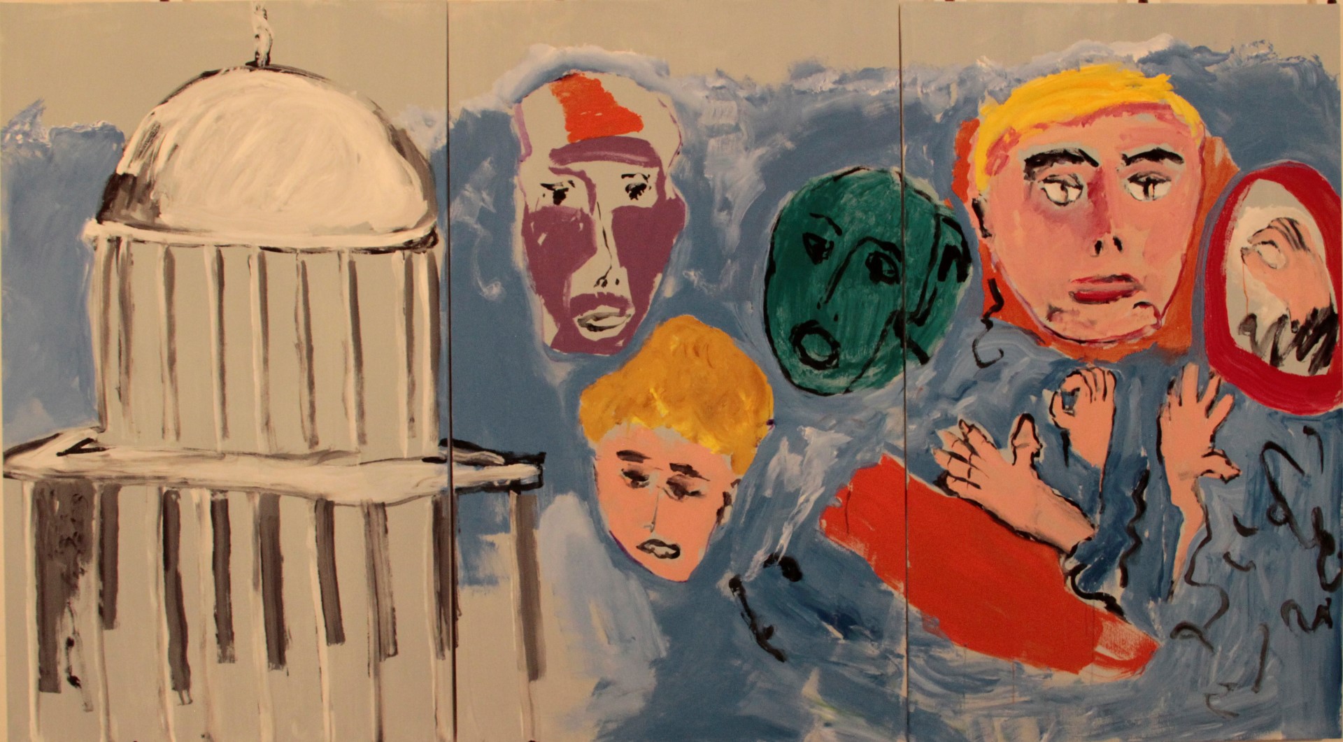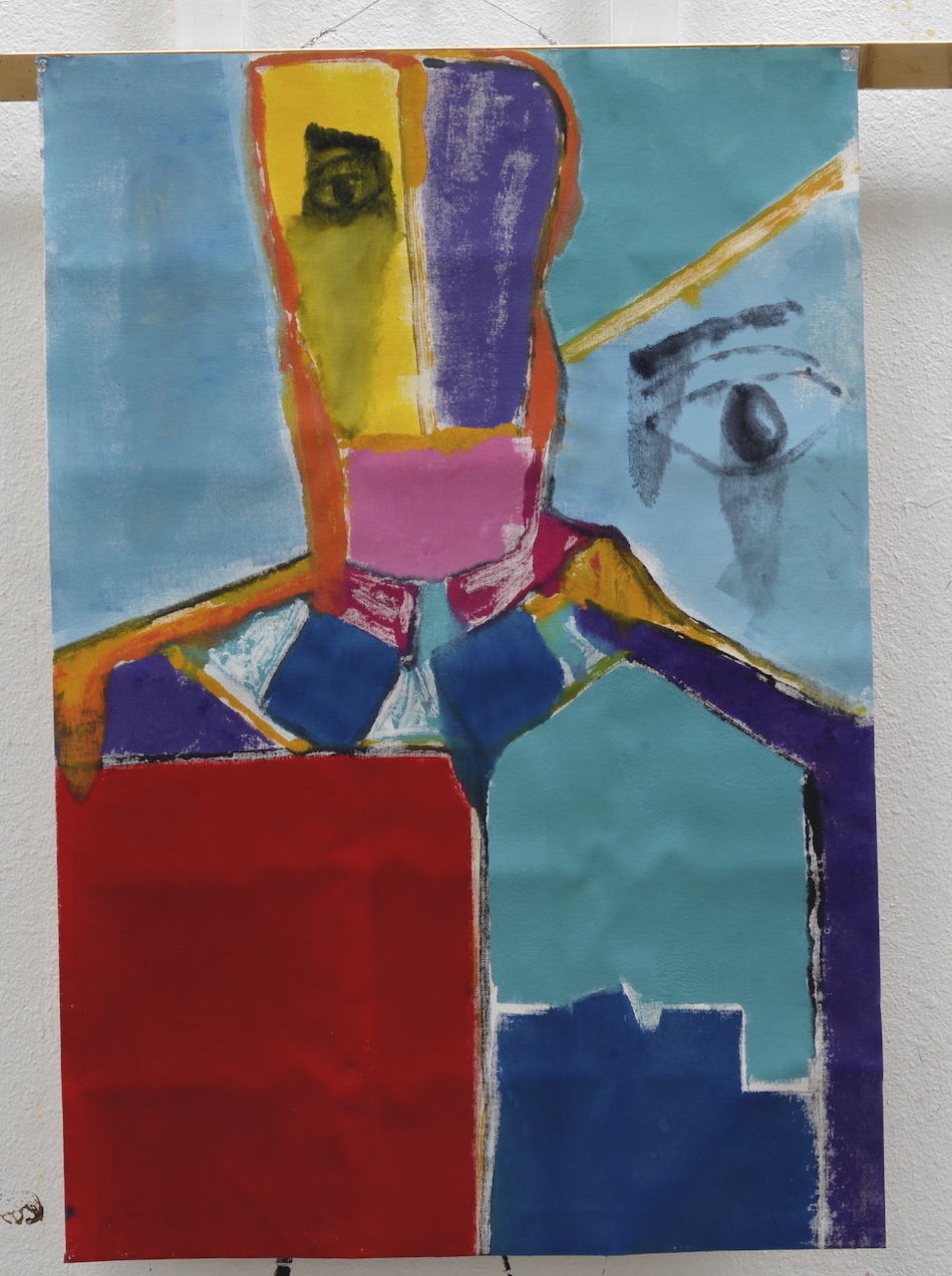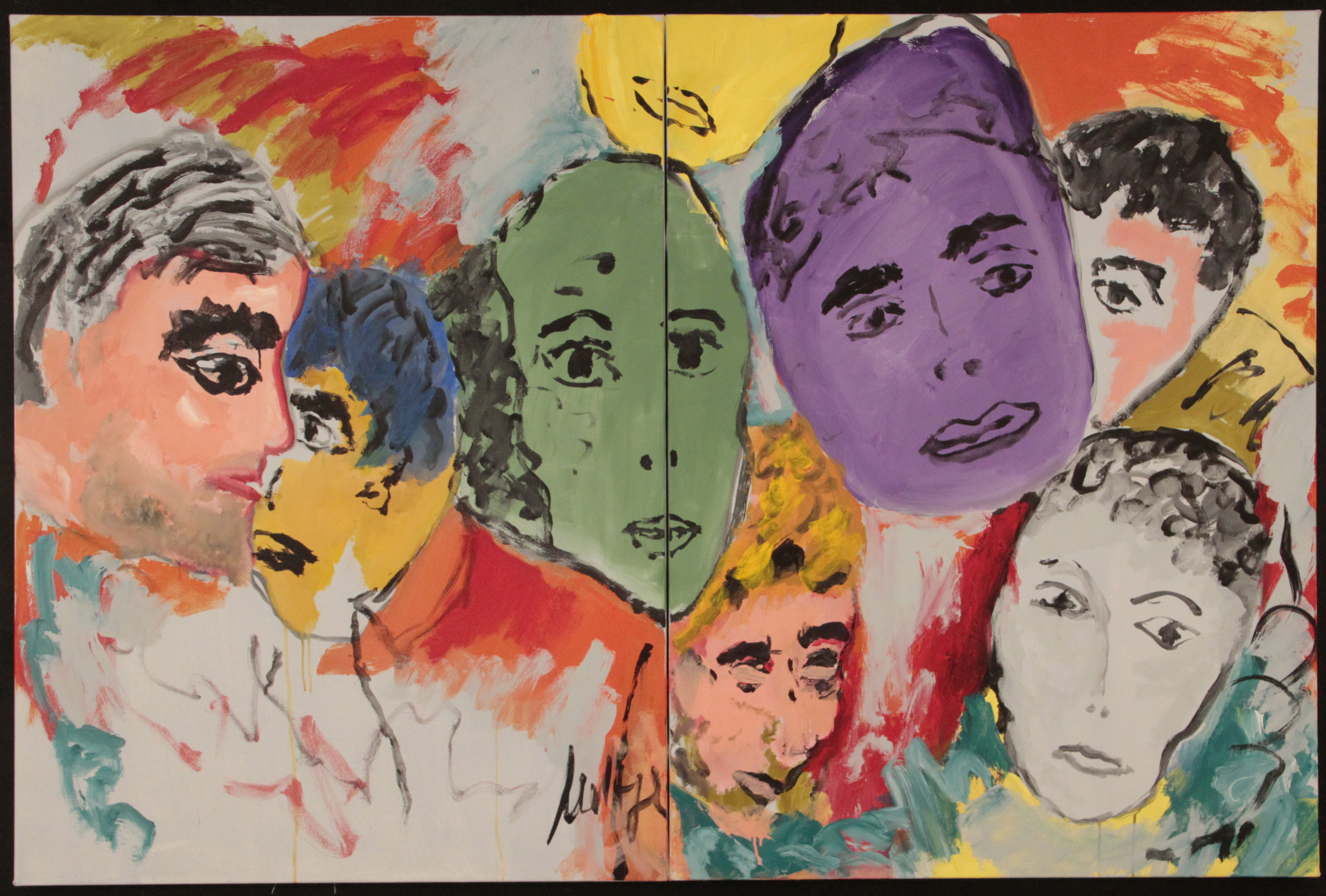 Acrylic painting. Multiple faces with various parts of faces in different colors. One eye TL, anotehr C and a third BL. Face in C facing L has nose and mouth and chin and hair. What appears to be a red ear is CR. There are two columns of horizontal brush strokes one BR in red one BC in black or dark browns.