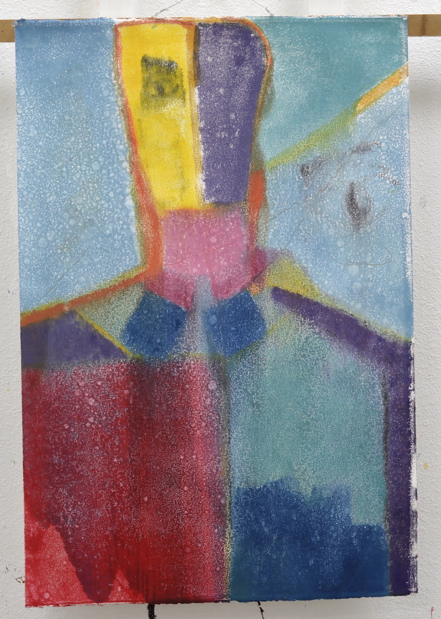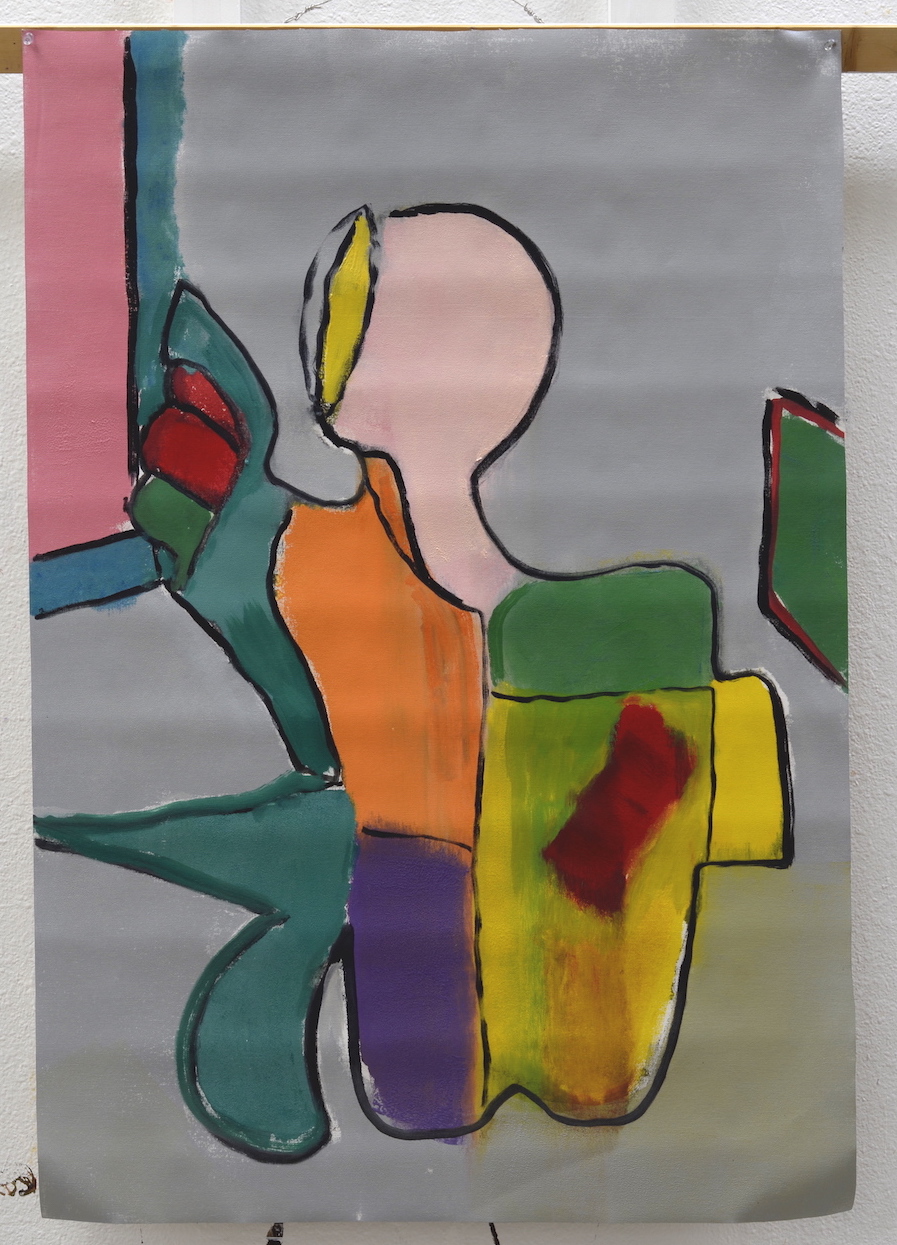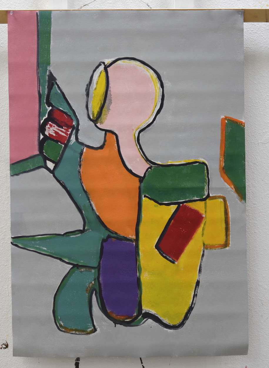 Acrylic painting. Appears to be abstract human form, seated. Head TC. Torso divided into several colored areas. e.g. Orange shoulder, blue lower back and buttock. Green leg extended across BR above signature. TR has geometric shape as if a wall hanging shown with perspective of depth.