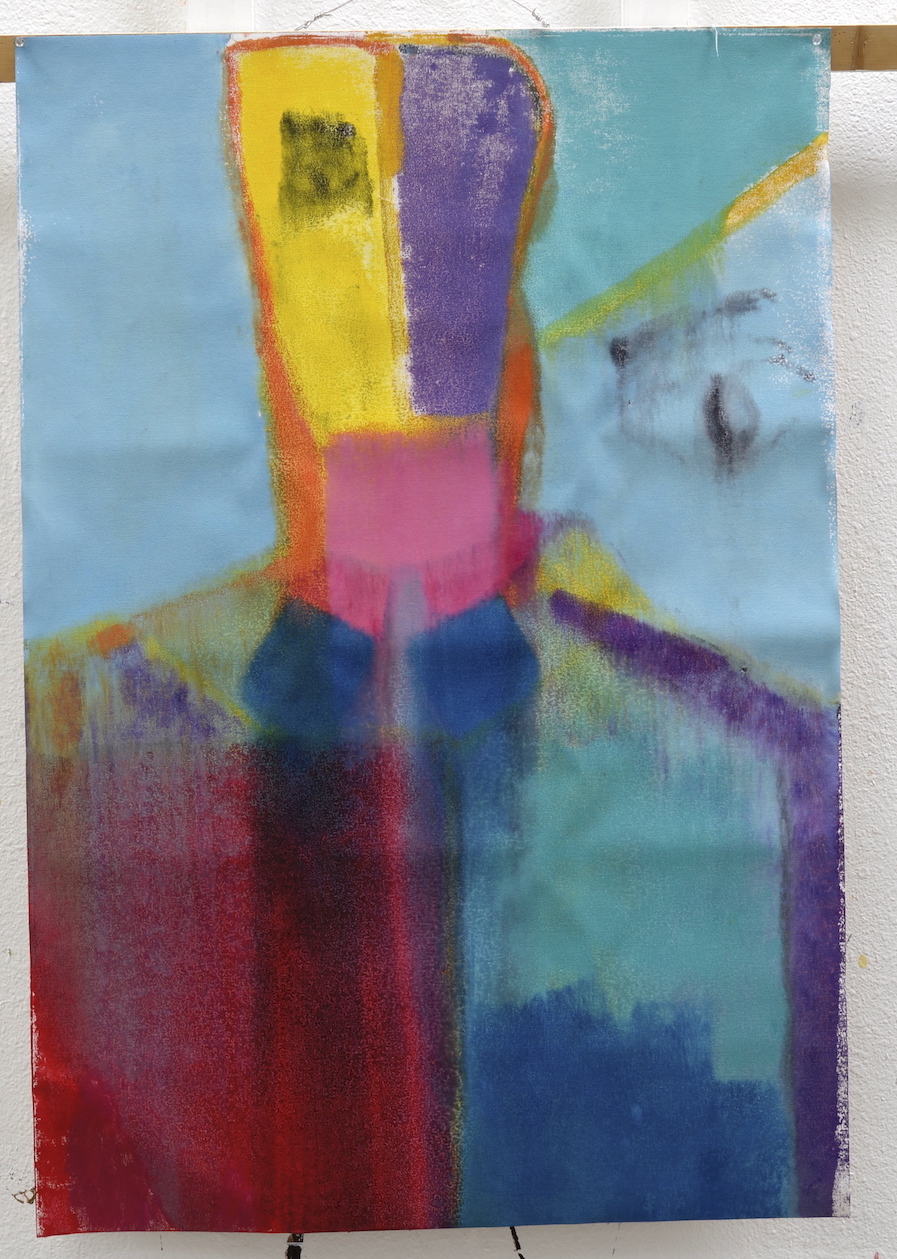 Acrylic painting. Portrait, bust TL to BL. Different areas of face are in different colors. Area of red BR with signature. Nearly parallel blue lines C. Dark tapering line TR to CR near edge of canvas.