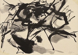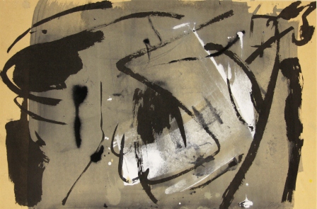 Background is primarily gray wash, brown paper shows on L and R edges. Black lines throughout. Some white through vertical C. Verso, backing board. Nothing.
